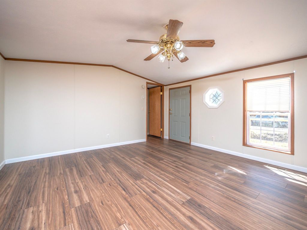 Beautifully remodeled and move in ready. This 2 bedroom 1 bath single wide manufactured home offers comfort, style and affordability all in one. Step inside to freshly painted interior, new floor coverings throughout, new baseboards and updated lighting creating a bright and welcoming feel from the moment you walk in. The spacious living room features a beautiful wood accent wall that adds warmth and character while the kitchen offers a pantry for extra storage and is equipped with an electric range and refrigerator. A washer and dryer are also included, making this home truly move in ready. Major updates provide peace of mind, including a New central air system and electric furnace heat. The home also features 2x6 walls for added insulation and efficiency. Outside, enjoy relaxing on the brand new large front deck with metal railing details, perfect for morning coffee or evening gatherings. The property also offers a newly installed white privacy fence, gravel driveway with room for multiple vehicles, and a pebble rock walkway leading directly to the front door. Other features include gutters and downspouts, new metal underpinning and a shingle roof. Recently surveyed and sitting on 0.41-acre lot, this home is located just outside the city limits but still very close to town. With its updates and convenient location this home is waiting for its next owner.